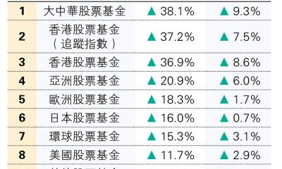 單計MPF股票基金類別,上月回報最好的是「大中華股票基金」,升4.9%,主要受惠於A股交易熾熱,而緊隨其後為「日本股票基金」,升3.8%。至於上月表現最差的是「亞洲股票基金」,僅錄得0.7%升幅,因最近印尼與泰國的政治風險升溫,使亞洲地區股票風險溢價上升。年初至今計,截至8月31日,「香港股票基金(追蹤指數)」繼續排首位,年內累漲27.7%,「大中華股票基金」排第二位,升26.3%,而第三位為「香港股票基金」,升26.1%(見表)。