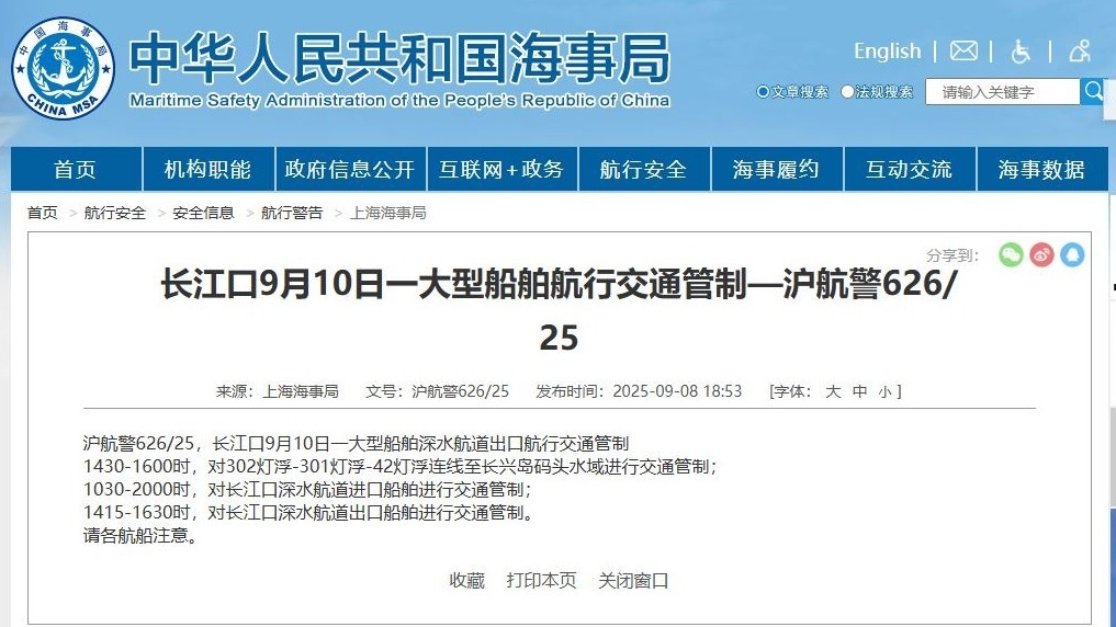 中國海事局官網昨日(8日)發布來自上海海事局的航行警告稱,周三(10日)一大型船舶深水航道出口實施交通管制,包括從上午10時半至晚上8時,對長江口深水航道進口船舶進行交通管制;下午2時15分至下午4時半期間,對長江口深水航道出口船舶及302燈浮—301燈浮—42燈浮連線至長興島碼頭水域進行交通管制。