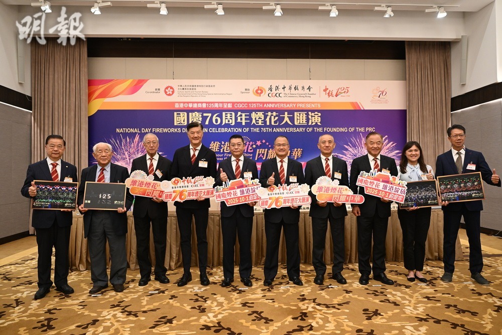 國慶煙花將於下月1日在維港舉辦,晚上8時開始將分為8幕上演,時長約23分鐘,合共放出3萬枚煙花。今年主題為「維港煙花 閃耀中華」,今年亦會同賀贊助商香港中華總商會成立125周年,因此,在煙花匯演正式開始前會於低空綻放「125」的字樣,亦會在分幕中隱藏「中總一二五」的字樣。中總希望煙花匯演吸引超過40萬人次,帶動兩岸餐廳及店舖消費。