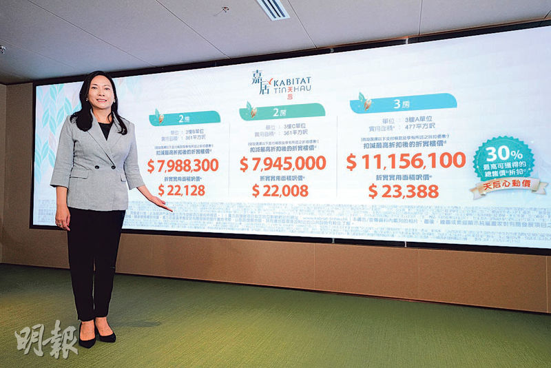 對於今次開價,嘉華國際營銷及市場策劃總經理(香港地產)朱美儀表示,項目定價屬「天后心動價」,主要參考項目自身優惠,並謂美國大有機會減息及《施政報告》公布利好消息下,相信發展商將陸續收窄折讓空間。