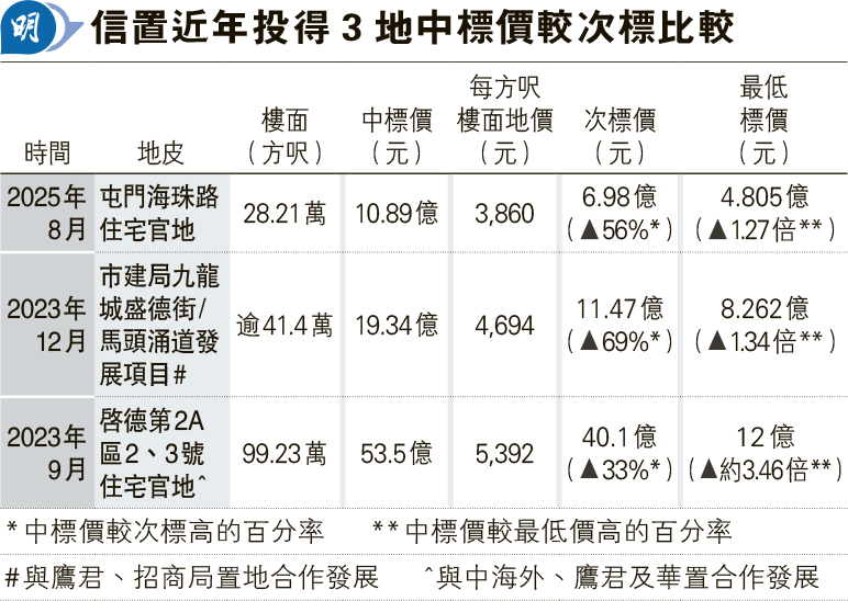 值得留意的是,上述地皮於截標前的估值介乎4.2億至7.9億元,每方呎樓面地價約1500至2800元,落選投標者的出價全屬市場預期之內,僅得信置以高於市場估值入標。上述地皮可建樓面約28.21萬方呎,預計提供525伙。事實上,近年樓市氣氛轉差,發展商出價轉趨審慎,惟信置仍進取投地,如2023年12月,信置以19.34億元中標市建局九龍城盛德街/馬頭涌道發展項目,以總樓面逾41.4萬方呎計,每方呎樓面地價4694元,雖低於市場估值下限,但中標價仍較次標11.47億元,大幅高出7.87億元或69%。
