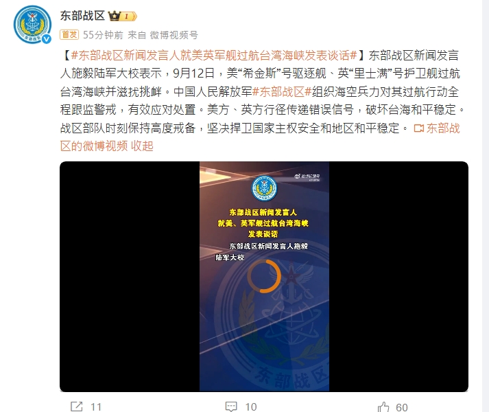 即時兩岸 美英軍艦穿航台海 東部戰區:全程跟監警戒 (23:15) 發佈於 2 個月 前 2025 年 9 月 12 日 By 明報 解放軍東部戰區新聞發言人施毅通報,9月12日,美「希金斯」號驅逐艦、英「里士滿」號護衛艦過航台灣海峽並滋擾挑釁。東部戰區組織海空兵力對其過航行動全程跟監警戒,有效應對處置。 施毅強調,美方、英方行徑傳遞錯誤信號,破壞台海和平穩定;戰區部隊時刻保持高度戒備,堅決捍衛國家主權安全和地區和平穩定。(東部戰區) 相關文章:台海局勢東部戰區編輯推介英美軍艦 Up Next 雲貴川今天有大暴雨 當局預警山洪災害 (01:27) 不要錯過 國務院同意10個要素市場化配置綜合改革試點 包括大灣區9市 (17:37) 繼續閱讀 贊助商 猜你喜歡 直升機航母艦隊國慶假期訓練 軍報:節日戰備值班 (08:00) 大陸熱播潛台諜戰劇《沉默的榮耀》宣傳「台灣必歸」 (15:28) 華東南擴導彈基地 紐時:劍指美台 美國防部料火箭軍擁500枚「關島快遞」東風26 龍應台倡台「和平推」 用柔韌將危險降溫 黃循財:有利國際環境不再 星寄望志同道合國鞏貿易 東部戰區陸軍發布軍營原創歌 : 《把勝利的旗幟插在寶島上》 (15:26)