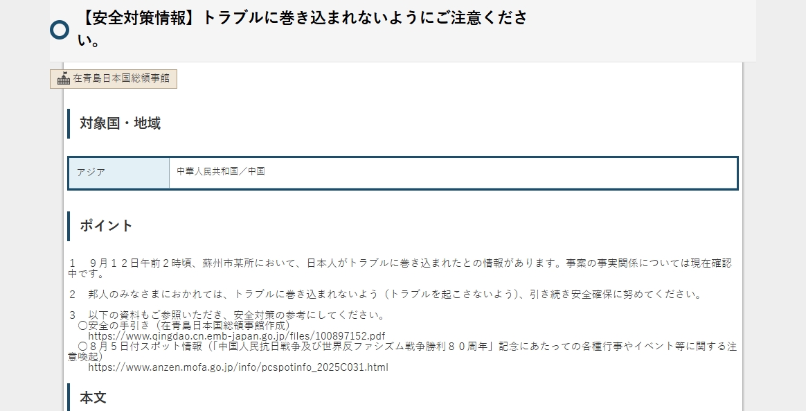 日本外務省9月12日發出安全提示,稱當天凌晨有日本公民在中國江蘇省蘇州市某處涉及糾紛,目前正在確認事件真相。外務省請所有日本公民繼續採取安全防範措施,確保自身安全,避免捲入(或引發)任何糾紛事件。