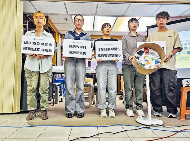 【明報專訊】關注草根生活聯盟(關草聯)昨發表基層清潔工作勞損與制度保障經驗調查報告,逾七成半受訪食環外判清潔工曾於工作期間出現痛症或勞損;當身體出現痛症或勞損,近八成選擇忍痛工作。關草聯稱帶病上班已成清潔工常態,建議檢討現行病假制度,取消最少連續4日病假才可領取疾病津貼的門檻,以確保任何病假日數均獲合理有薪保障,避免工友帶病上班。