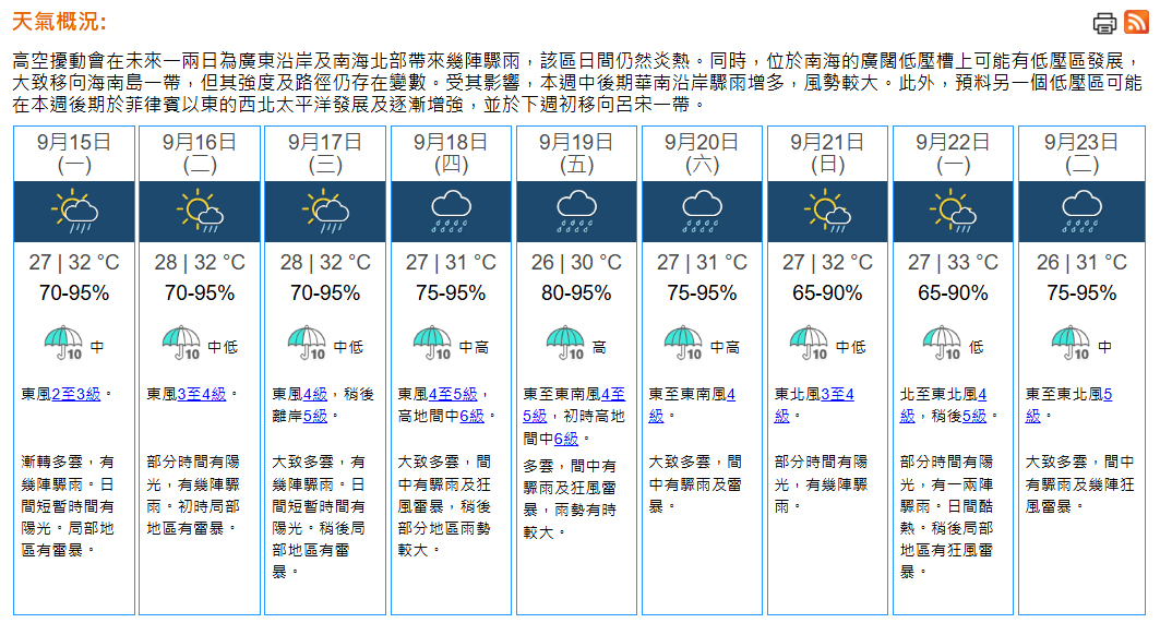 即時熱點 天氣|天文台:周一漸轉多雲有驟雨 局部地區有雷暴 (19:32) 發佈於 2 個月 前 2025 年 9 月 14 日 By 明報 本港地區明日(15日,周一)天氣預測:初時大致天晴,漸轉多雲,有幾陣驟雨。早上最低氣溫約27°C,日間短暫時間有陽光,市區最高氣溫約32°C,新界再高一兩度。局部地區有雷暴。吹輕微至和緩偏東風。展望隨後一兩日有幾陣驟雨,日間短暫時間有陽光及炎熱。本周後期天氣不穩定,驟雨增多,風勢較大。(天文台) 相關文章:天文台天氣天氣速遞編輯推介 Up Next 風雨蘭|賞花短片:沙田石門、粉嶺風雨蘭綻放 恍如滿地「粉紅星星」 (14:18) 不要錯過 Tyler Robinson Q&A|槍殺柯克疑兇曾是高材生 獲獎學金入大學 本是特朗普狂熱支持者 (15:19) 繼續閱讀 贊助商 猜你喜歡 天氣|天文台:日間最高28°C 吹和緩北至東北風 (09:31) 天氣|天文台:周日多雲日間乾燥 氣溫24至30°C (20:01) 短片:樺加沙一個月後 重災區將軍澳海濱未復常、富麗敦海洋公園酒店大門復修中 (08:59) 天文台:今日沿岸水位高0.5至1米 晚上漲潮部分沿岸低窪地區或輕微水浸 (08:35) 天氣|天文台:本港今早普遍18°C 未來兩三日氣溫回升 (08:23) 天文台上午8時40分錄18.4°C 今年入秋以來最低 (09:03)