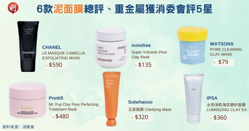 消費者委員會(消委會)測試30款市面上的泥狀清潔面膜,發現超過9成樣本檢出不同種類的重金屬。不過有11款泥狀清潔面膜就獲消委會總評5星滿分,售價由79元至590元不等。11款5星面膜中,其中6款連重金屬評分都獲得5星,即沒有或含較少重金屬成分的泥狀清潔面膜,市民可以更安心選購。