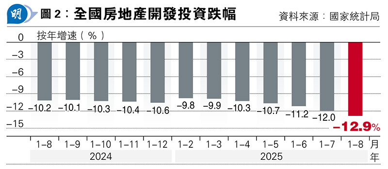 【明報專訊】據國家統計局數據顯示,2025年1至8月份全國房地產開發投資持續大跌,跌至6.0309萬億元(人民幣,下同),按年下降12.9%(圖2),較市場預期跌12.5%為差,亦較今年1至7月份跌幅12%擴大;其中,住宅投資4.6382萬億元,下降11.9%。