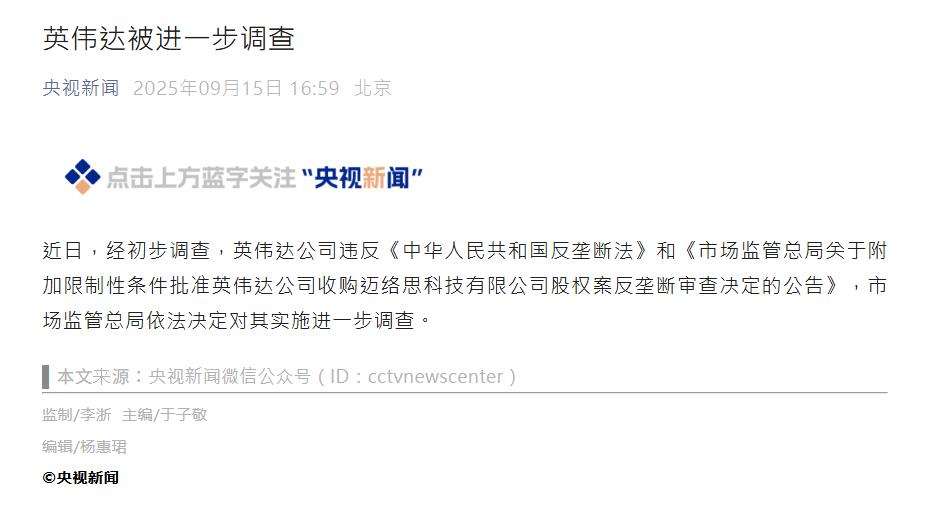 國家市監總局今(15日)下午發布聲明表示,近日,經初步調查,英偉達公司違反《中華人民共和國反壟斷法》和《市場監管總局關於附加限制性條件批準英偉達公司收購邁絡思科技有限公司股權案反壟斷審查決定的公告》,市場監管總局依法決定對其實施進一步調查。