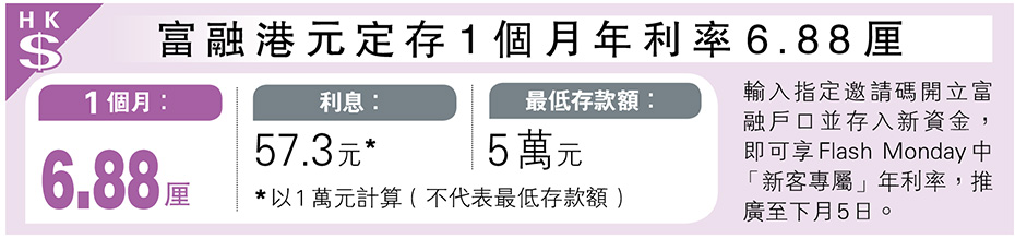 經濟 富融港元定存1個月年利率6.88厘 發佈於 3 個月 前 2025 年 9 月 17 日 By 明報 【明報專訊】輸入指定邀請碼開立富融戶口並存入新資金,即可享Flash Monday中「新客專屬」年利率,推廣至下月5日。(圖) 日報新聞-相關報道: 建行亞洲人幣定存3個月年利率5.88厘 (2025-09-17) 相關文章:建行亞洲人幣定存3個月年利率5.88厘 (2025-09-17) Up Next 姜靜:美元顯著下行機率或較低 不要錯過 張兆聰:信攜程前景 可安心持有 繼續閱讀 贊助商 猜你喜歡