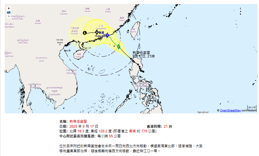 【19:45】位於呂宋附近的熱帶氣旋已進入本港800公里範圍,天文台會在今晚(17日)9時20分發出一號戒備信號。