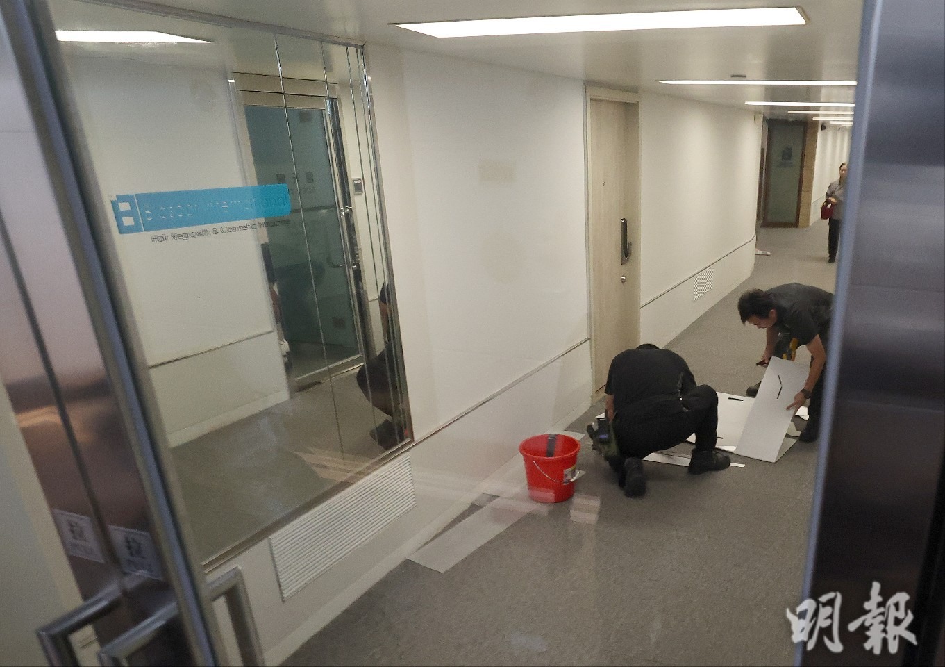 衞生署昨公布,兩名57歲女子昨於中環Bioscor Hong Kong接受靜脈輸注後出現敗血性休克,已聯同警方到處所調查,警方以涉嫌無牌行醫拘捕3人。相關處所今早未及10時,有工人在所在樓層拆除水牌,並有自稱管理處人員拒絕傳媒採訪。至中午時份,涉事處所門上的名字被白色卡紙遮蔽,樓層大堂有保安駐守。