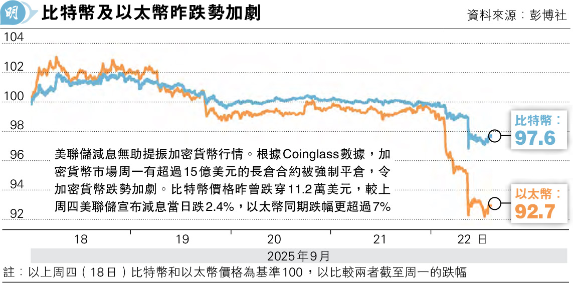 【明報專訊】美聯儲上周宣布減息,無助提振加密貨幣行情,加密貨幣價格周末下滑,並在周一觸發大量平倉。根據Coinglass數據,加密貨幣市場周一有超過15億美元(約117億港元)的長倉合約被強制平倉,是3月底以來加密貨幣領域最大規模的清算浪潮,令加密貨幣跌勢加劇。比特幣價格昨曾跌穿11.2萬美元,較上周四美聯儲宣布減息當日跌2.4%。以太幣昨曾跌穿4100美元,較上周四跌超過7%。Solana、Avalanche等加密貨幣普遍下滑。美股三大指數上周再創新高後,早段個別發展。市場關注美國聯邦政府關門的風險,若兩黨無法於9月底通過開支法案,美國聯邦政府將面臨停擺。