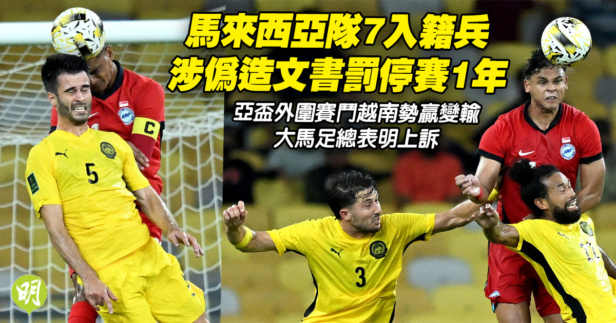 國際足協(FIFA)昨晚(26日)宣布,馬來西亞足總為7名入籍球員偽造或篡改文件,重罰罰款35萬瑞士法郎(約340萬港元),7名球員即日起停賽1年。馬來西亞足總隨即發聲明,強調申請入籍程序「完全透明」,會就裁決上訴。