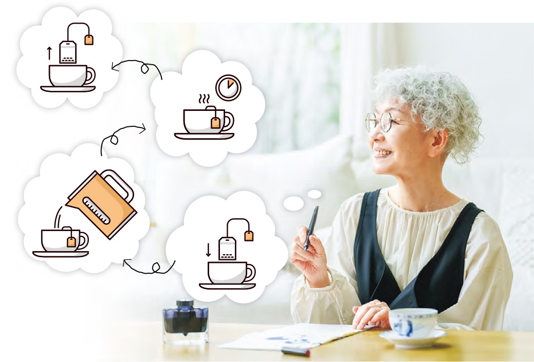 舉例說,冲泡一杯茶,先在腦中構思整個過程的畫面(視覺想像);首先在櫃裏拿出茶葉,放在桌面上(位置記憶法);拿出水煲,裝水,把水煲滾(記憶分塊);然後拿出茶壺,打開壺蓋,把茶葉放進去,再去取熱水,將熱水倒入茶壺。在這個想像的過程中,我們可能會發現自己遺漏了哪些步驟,從而更清楚整個活動流程(知識建構)。同樣,做家務時,可以在腦海中想像家裏平面圖,在腦中構思整過過程。
