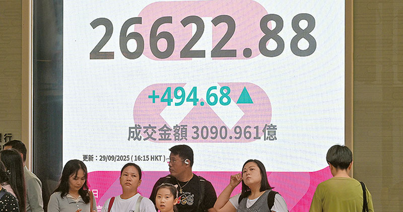 金價再創新高,紫金(2899)及招金(1818)升近6%至近7%。晶片股向好,華虹(1347)升近6%,中芯(0981)升近5%。臨近十一國慶黃金周長假期,博彩股上升,銀娛(0027)及金沙(1928)升近3%至近5%。