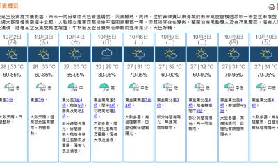 即時熱點 天氣|天文台:周二天晴酷熱 最高氣溫33°C (20:57) 發佈於 3 天 前 2025 年 9 月 29 日 By 明報 天文台表示,本港地區周二(30日)大致天晴,最低氣溫約28°C,日間酷熱,市區最高氣溫約33°C,新界再高一兩度。吹微風。隨後兩三日大致天晴及持續酷熱。周末期間風勢頗大及有驟雨。 高空反氣旋正為中國東南部帶來普遍晴朗的天氣。熱帶風暴博羅依已減弱為熱帶低氣壓。在周二(29日)晚上8時,博羅依集結在萬象以北約260公里,預料向西北偏西移動,時速約26公里,橫過中南半島內陸並逐漸消散。 相關文章:天文台天氣天氣速遞編輯推介 Up Next 圖看內蒙古阿爾山秋韻 (14:06) 不要錯過 天氣|天文台:周一早上局部地區有驟雨 日間炎熱 (20:37) 繼續閱讀 贊助商 猜你喜歡 周末近天文大潮 強颱料入400公里 天氣|天文台:大致天晴 日間酷熱及乾燥 (08:17) 天氣|天文台:周四天晴 日間酷熱最高33°C (21:14) 天氣|天文台:天晴酷熱 周末期間風勢頗大有驟雨 (08:21) 天氣|天文台:周三天晴酷熱 最高氣溫33°C (21:16) 天氣|天文台:早上局部地區有驟雨 最高氣溫32°C (08:17)