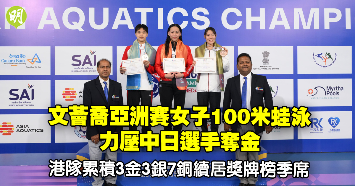 中國香港代表隊於印度舉行的游泳亞洲賽再寫佳績,其中16歲新星文薈喬繼日前取得1金1銀後,昨(30日)再於女子100米蛙泳力壓中、日勁敵奪金。連同李芯瑤在女子100米自由泳摘銀,以及高嘉蓮與徐奕祺分別在女子800米自由泳與男子100米蛙泳添銅,港隊單日再添1金1銀2銅,總成績3金3銀7銅續排獎牌榜季席。
