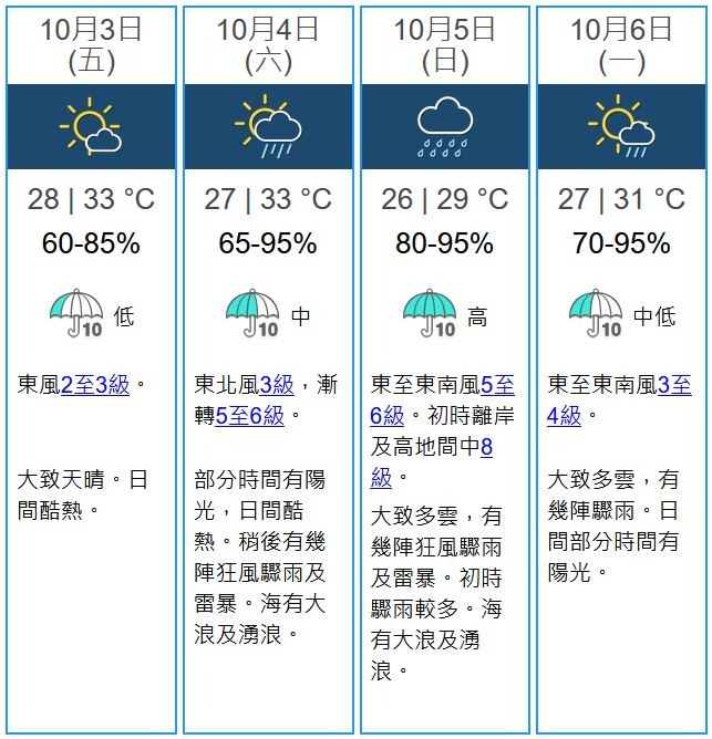 即時港聞 天文台考慮周五晚發出一號戒備信號 (12:07) 發佈於 2 天 前 2025 年 10 月 2 日 By 明報 天文台發出特別天氣提示,位於菲律賓以東海域的熱帶氣旋麥德姆會在明日(3日)橫過呂宋,並在稍後進入本港800公里範圍內,天文台會考慮在明晚發出一號戒備信號。 按照現時預測,麥德姆會在周末期間大致移向廣東西部沿岸至海南島東部一帶並逐漸增強。本港周六(4日)稍後至下周日(5日)天氣漸轉不穩定,風勢頗大,海有大浪及湧浪,間中有狂風驟雨。天文台會視乎麥德姆與珠江口的距離、其強度及本地風力變化,評估是否需要在星期六日間改發更高熱帶氣旋警告信號。市民請密切留意天文台的最新天氣消息。 相關文章:一號戒備信號天文台麥德姆 Up Next 10人涉假扮PayMe職員騙取逾150萬 一人認串謀詐騙判囚32個月 (16:33) 不要錯過 啟德體育園舉行開幕後首個國慶升旗儀式 同場設攤位及國安展覽 (16:20) 繼續閱讀 贊助商 猜你喜歡 天文台:考慮今晚發一號戒備信號 將評估需否明日日間改發更高警告信號 (08:47) 周末近天文大潮 強颱料入400公里 麥德姆|麥德姆周六進入本港800公里範圍 央視:料為華南地區帶來明顯風雨 (11:27) 天氣|酷熱警告生效 天文台:周四周五天晴酷熱 周六驟雨漸增 (08:14) 麥德姆|央視:料麥德姆為華南地區帶來明顯風雨 (13:40) 麥德姆 | 珠西海域漁船明晚全部回港避風 (21:56)