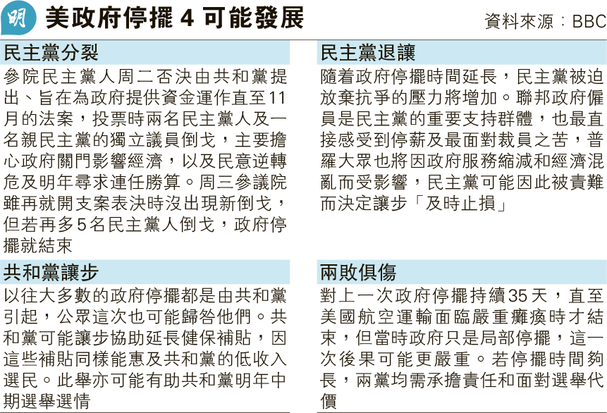 【明報專訊】美國聯邦政府陷入近7年來首次停擺,特朗普政府周三(1日)採取措施意圖加大停擺殺傷力並報復政敵,宣布凍結260億美元(約2028億港元)專針對民主黨主政州份的聯邦資金,又表示大規模裁員將於兩天內展開。民主黨人批評新措施將加劇失業,又指「特朗普以國家利益作人質」以作政治施壓。