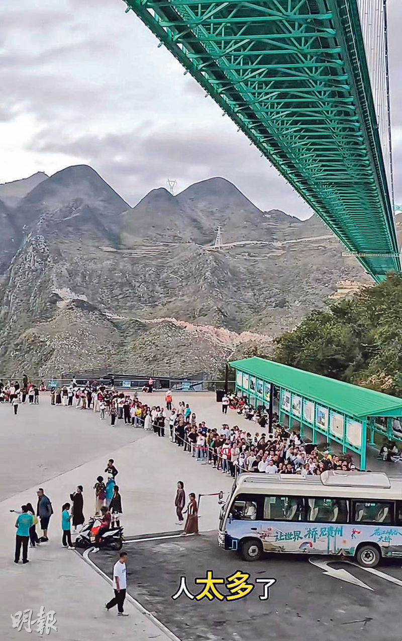 【明報專訊】世界第一高橋貴州花江峽谷大橋通車不久,在國慶中秋長假期間成為打卡熱點,有遊客披露,近千人一度在大橋滯留數小時。