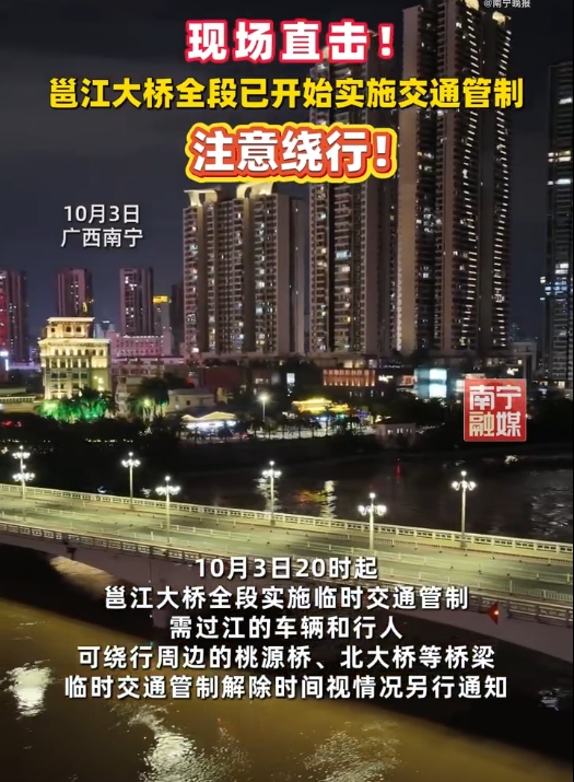 即時兩岸 洪峰殺到 廣西南寧封鎖邕江大橋 (01:25) 發佈於 2 個月 前 2025 年 10 月 4 日 By 明報 受上游洪水影響,鬱江水位持續上漲,廣西南寧市應急管理委員會10月3日宣布將防汛(城市防洪)應急響應從三級提升至二級,晚上8時起對邕江大橋全段實施臨時交通管制。 通報稱,受上游左江、右江持續來水影響,預計10月3日夜間至4日凌晨,鬱江南寧水文站河段將出現76.5米左右的洪峰水位,超警戒水位3.5米,防汛形勢嚴峻。(綜合報道) 相關文章:廣西洪水編輯推介邕江大橋 Up Next 麥德姆 | 廣東轉移逾15萬人 7市啟動應急響應 (00:59) 不要錯過 解放軍強化對台斬首行動 台防長:有相關預應 (17:53) 繼續閱讀 贊助商 猜你喜歡 「麥德姆」雨水致廣西江河復漲 鬱江出現今年第2號洪水 (18:35)