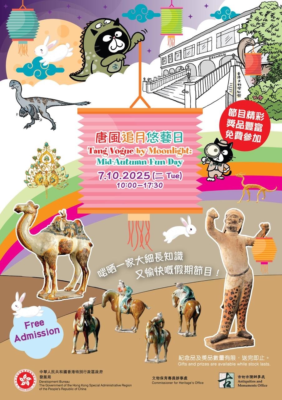 即時港聞 古物古蹟辦事處下周二舉辦「唐風追月悠藝日2025」 (16:48) 發佈於 2 個月 前 2025 年 10 月 4 日 By 明報 古物古蹟辦事處將於下周二(7日)早上10時至5時半,在香港文物探知館舉行「唐風追月悠藝日2025」。參加者完成主題展覽和常設展的指定任務後可換領禮物。 「唐風追月悠藝日」主題活動內容包括「空降長安城」、「狂草千文卷」、「搜捕馬球員」、「自拍亭」、「中秋探知館大挑戰」和「唐風萬里:多元交融開放的盛世」專題展覽;恐龍主題活動則包括「摺紙恐龍駱駝大比拼」、「手扭動物汽球」和「泥膠恐龍工作坊」;古蹟主題活動包括「彩筆繪古蹟」及印章收集活動。 相關文章:古物古蹟辦事處編輯推介 Up Next 政府聯合行動巡西貢橋嘴洲 提醒遊客保護生態勿傷害生物 (16:12) 不要錯過 北都規劃及發展工作組召開首次會議 (17:10) 繼續閱讀 贊助商 猜你喜歡 炮台歷史知多少?海防博物館設史蹟徑賞堡壘炮台 東涌炮台曾作校舍 (13:18)