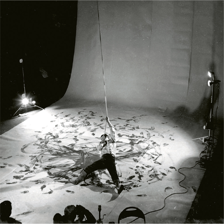 協會成員之一白髮一雄(Kazuo Shiraga,1924-2008)便以結合行為與繪畫的創作方式,嘗試以藝術回應社會,並發展出一套嶄新的藝術語言——「足繪」(Foot painting)。1955年,他在東京的「具體藝術展」(Gutai Art Exhibition)中首次演出《挑戰泥土》(Challenging Mud)。他將自己拋入象徵着破壞與重建的混凝土、黏土與礫石等材料中作畫,以身體為媒介,模糊了繪畫、雕塑與行為藝術的界線。這不僅是一次美學上的實驗,更是一種象徵性的行動:他要與日本破敗的現狀作正面對抗,並在充滿象徵性的廢墟中展現出創造的力量。對於習慣傳統繪畫風格與政治宣傳藝術的觀眾而言,面對這樣一個充滿原始力量、非語言化、以肉身實踐的藝術表現,無疑是一種價值觀的挑戰。
