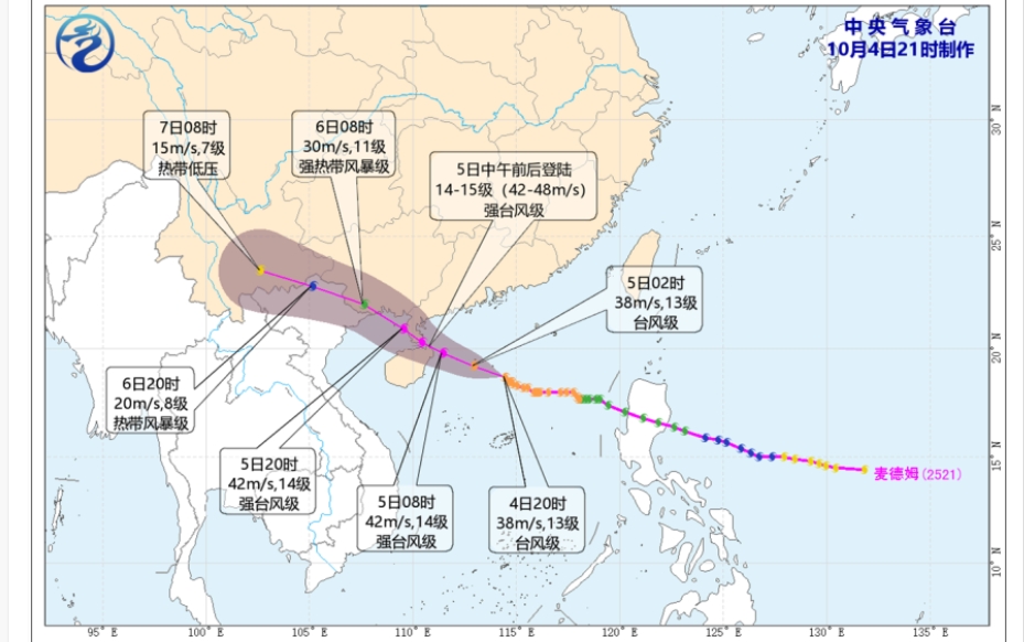 中央氣象台報告,4日晚上10時,麥德姆距離廣東省徐聞縣東偏南方向約415公里,最大風力13級(約137公里時速),將以每小時25至30公里的速度向西偏北方向移動,強度逐漸增強,預計5日中午前後在廣東電白至海南瓊海一帶沿海登陸。