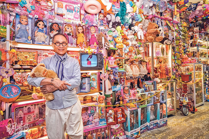 「香港館」正門堆滿洋娃娃、西瓜波、扭蛋機等懷舊玩具。陳幼堅接受本報記者訪問表示,靈感來自有「玩具街」之稱的灣仔太原街及深水埗福榮街,並與電影美術指導文念中、建築學者蘇暢合作營造相關場景,相信能讓市民產生共鳴,向旅客展現香港獨有面貌。