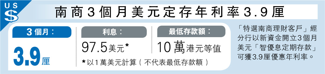 經濟 南商3個月美元定存年利率3.9厘 發佈於 2 週 前 2025 年 10 月 8 日 By 明報 【明報專訊】「特選南商理財客戶」經分行以新資金開立3個月美元「智優息定期存款」可獲3.9厘優惠年利率。 日報新聞-相關報道: 工銀亞洲3個月港元定存年利率3.5厘 (2025-10-08) 相關文章:工銀亞洲3個月港元定存年利率3.5厘 (2025-10-08) Up Next 港股9月日均成交3167億 創新高 不要錯過 ACCA報告指企業 對全球貿易樂觀 繼續閱讀 贊助商 猜你喜歡
