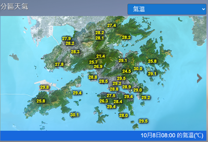 即時熱點 天氣|酷熱警告生效 天文台:周末有一兩陣驟雨 (08:22) 發佈於 1 天 前 2025 年 10 月 8 日 By 明報 上午8時,天文台錄得氣溫28.8°C,相對濕度72%。酷熱天氣警告現正生效。 高空反氣旋正為中國東南部帶來大致晴朗的天氣。在上午8時,超強颱風夏浪集結在東京之西南偏南約720公里,預料向北或東北偏北移動,時速約15公里,橫過日本以南海域。此外,一個低壓區正為西北太平洋帶來不穩定天氣。 本港地區今日(8日)天氣預測大致天晴。日間酷熱,市區最高氣溫約33°C,新界再高一兩度。吹輕微至和緩東至東北風。展望未來一兩日大致天晴。周末期間部分時間有陽光,有一兩陣驟雨。(天文台) 相關文章:天文台天氣天氣速遞編輯推介 不要錯過 短片:華富邨中秋舞火龍 居民:希望不是最後一次 (13:05) 繼續閱讀 贊助商 猜你喜歡 天氣|天文台:天晴酷熱最高33°C 局部地區有驟雨 (08:14) 天氣|天文台:周三天晴酷熱 最高33°C (21:00) 水利部和中國氣象局發布山洪預警 (22:56) 天氣|天文台:大致多雲 最高氣溫32°C (08:13) 中國北方局部明起降溫10℃以上 青藏有暴雪 (19:35) 天文台發出一號戒備信號 (15:40)