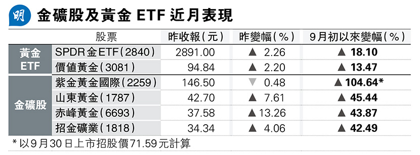 昨日港股金礦股繼續上升,赤峰黃金(6693)上升13.26%,山東黃金(1787)升7.61%,自9月初以來已累升逾四成,半新股紫金黃金國際(2259)微跌0.48%,不過以上月底上市招股價計算,已經上升1.04倍。美股金礦股亦表現強勢,市值最大金礦商ETF VanEck黃金礦業ETF(美:GDX),昨日開市上升2.22%報78.7美元,9月以來累升21.84%。