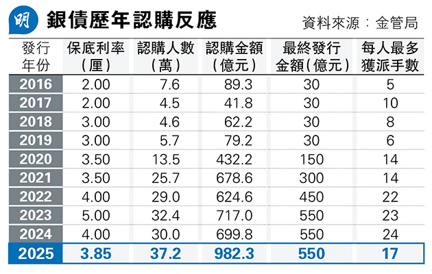 【明報專訊】今年度銀色債券上月底結束認購,政府昨公布配發結果。今年共收到37.18萬份有效申請,認購金額達982.27億元,與上月底公布的初步認購結果接近,兩者同創2016年發行銀債以來新高。銀債最終發行額為550億元,高於500億港元的目標發行額,每名投資者最多可獲17手,為2021年以來最少獲派手數,單計自2022年起發行額上調至550億元,則為獲發手數最少。