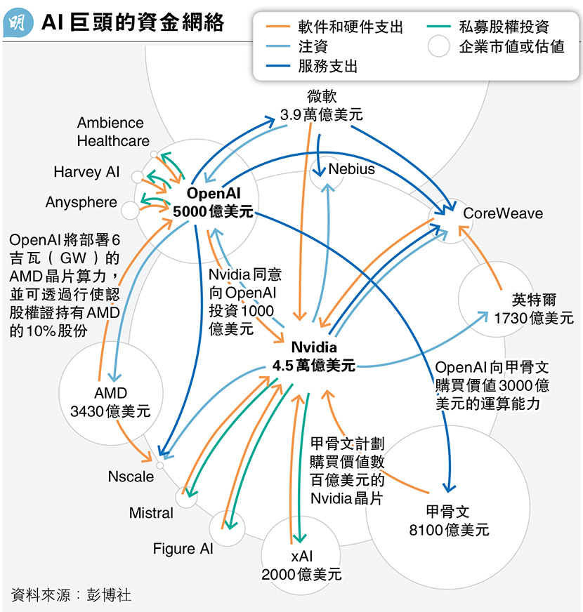 市場憂慮這些頂尖AI企業,與雲端服務供應商及其他AI初創敲定互相關聯的商業交易,將眾多公司的命運綑綁一起,「人為」支撐AI投資熱,加劇潛在的AI泡沫風險,使熱錢影響到股債市場、房地產及能源等幾乎所有經濟領域。