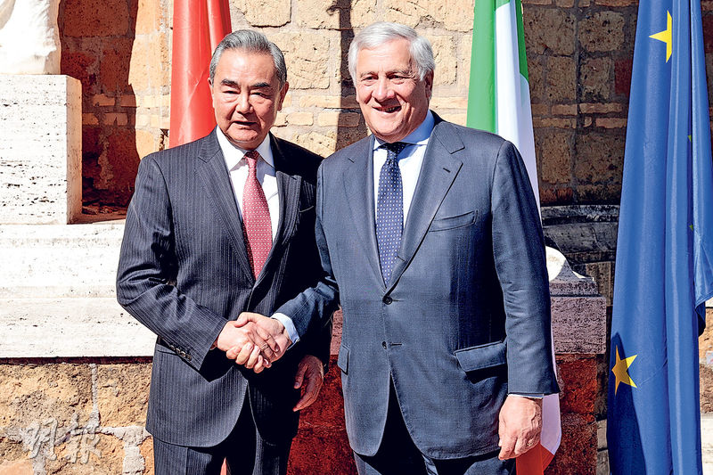 新華社昨晚發布,王毅在聯席會議上說,中意合作面臨新形勢、新機遇、新挑戰。中方願同意方推動合作機制向更加系統化的「2.0版本」升級,包括強化戰略屬性,加緊推動三年行動計劃落地;積極推動交流互訪,協助兩國企業、機構對接;三是促進地方合作等。