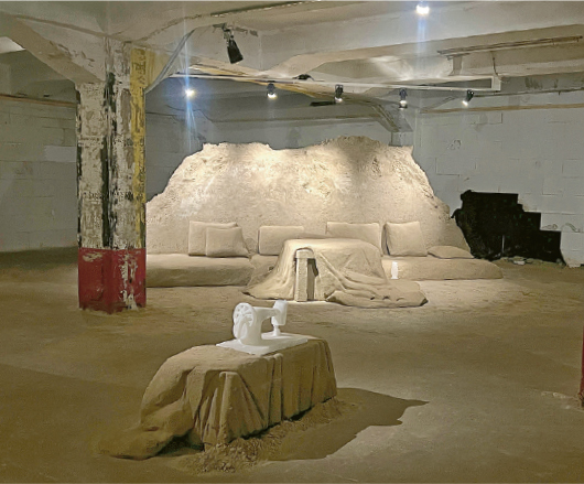 步入晦暗的展場,一座座沙雕塑散佈四周,貌似梳化、茶几、櫥櫃、大門。可是,它們並無家具的功能,輕輕一堆就會倒下,被置在路中心,更像一些紀念碑。這個「平面圖」正正映照Narges Mohammadi從腦海挖掘的記憶,無從完整。小時候,藝術家在家鄉阿富汗飽受內戰煎熬,活在飢餓和炮火中。她記得,當時許多家庭只能買混了沙子的麵粉來充飢。後來舉家踏上逃難的路,四處流徙。