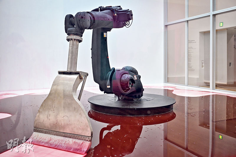 旁邊是一間玻璃房,房內的機械手臂揮舞着橡膠刮刀,反覆將地上的深紅色液體掃向自己。機械臂的揮舞沒有固定方向,液體流動更是隨性,場面猶如嗜血的機械怪物正失控——失控的怪獸被困在「可控」的玻璃房中;房外的觀眾置身「可控」的安全範圍,卻難以自控投去獵奇目光,房內房外,機械與人,到底是誰可控,誰又失控?這是古根漢美術館委約藝術團體孫原&彭禹創作的《難自禁》(Can’t help myself),作品曾在第58屆威尼斯雙年展展出,今次為首次在亞洲亮相。曾有人形容《難自禁》中的機械臂如同西西弗斯,永無止境地清掃永遠無法控制的液體,「這是一種非常具有象徵性的方式,解構了現代生活的許多方面,比如關於自主權與控制」,皮力說。他說,展覽不僅是討論科技、藝術,或是中國,而是通過這些視角來反思,「審視我們這個時代普遍的人類處境——透過藝術與科技,我們可以看到這種新處境如何引起社會變化,互聯網又如何重塑了人與人的連接與理解」。