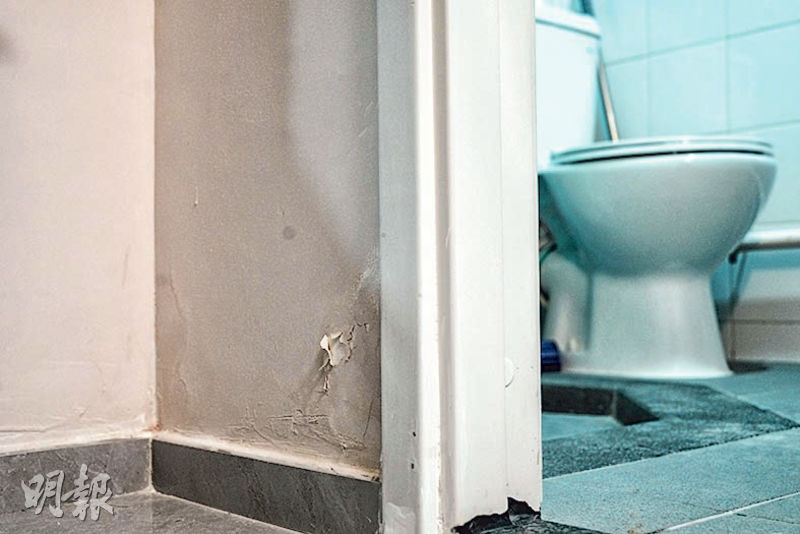 住戶黃先生稱單位僅做過簡單裝修,沒改動廁所門兩側牆身,仍在9月初發現兩邊牆腳滲水,現時該處牆身突起,但承建商以「裝修時有撞擊」為由拒絕處理。