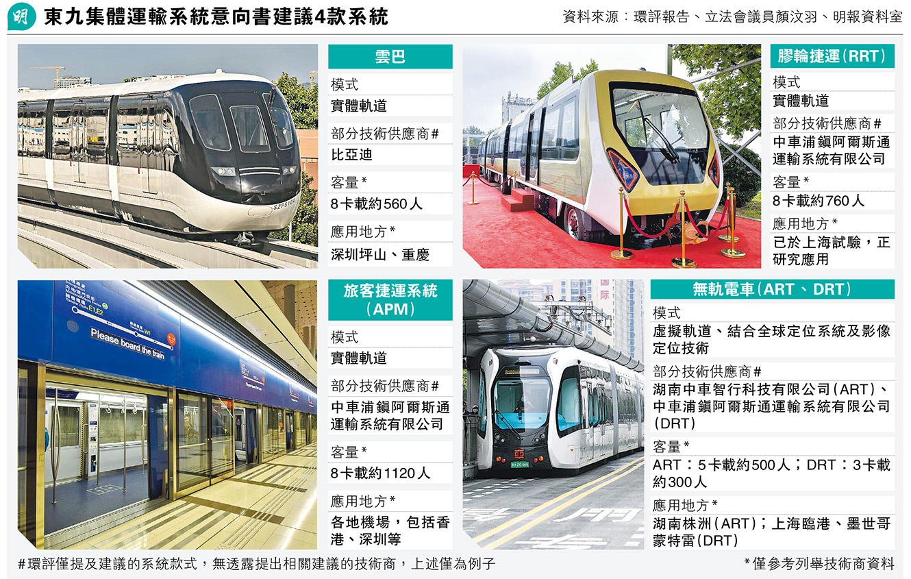 環評報告僅提及系統款式,無透露有何技術商提交相關建議。翻查資料,4款系統在內地均有供應商,比亞迪生產雲巴,中國中車旗下不同子公司則供應其餘3款,中車浦鎮阿爾斯通運輸系統有限公司供應RRT、APM及DRT,湖南中車智行科技有限公司則供應ART。當中APM載客量最高,8卡可載逾千人(見表);爬坡能力則DRT最好。