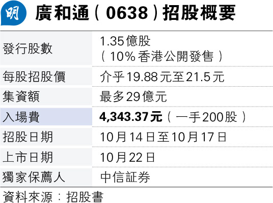 【明報專訊】A+H新股陸續有來,A股上市公司、市值逾250億元的無線通信模組提供商廣和通(0638),昨日起至本周五(17日)招股,採取不設回撥的機制B發行,全球發售1.35億股H股,10%於香港公開發售。每股招股價介乎19.88元至21.5元,集資最多29億元。一手200股,入場費4343.37元,預期10月22日掛牌(見表)。