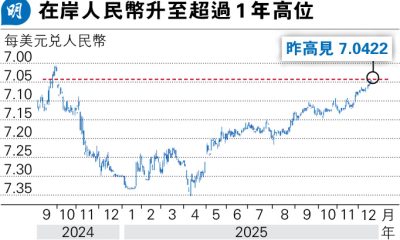 【明報專訊】中美貿易衝突再次升溫,人民銀行昨日出乎市場意料地將人民幣中間價調升至7.0995元,釋出要強烈穩定匯率的信號,為自去年11月6日後以來,首次開出強過7.1水平的中間價。昨日人行中間價,較彭博收集市場所預期的均值7.132、高出325點子(1元等於1萬點子)。人行開出強於預期的中間價後,在岸及離岸人民幣隨即走強,截至昨晚8時45分,離岸人民幣升0.11%至7.1323,曾一度高見7.1249。在岸價升0.14%至7.1271。