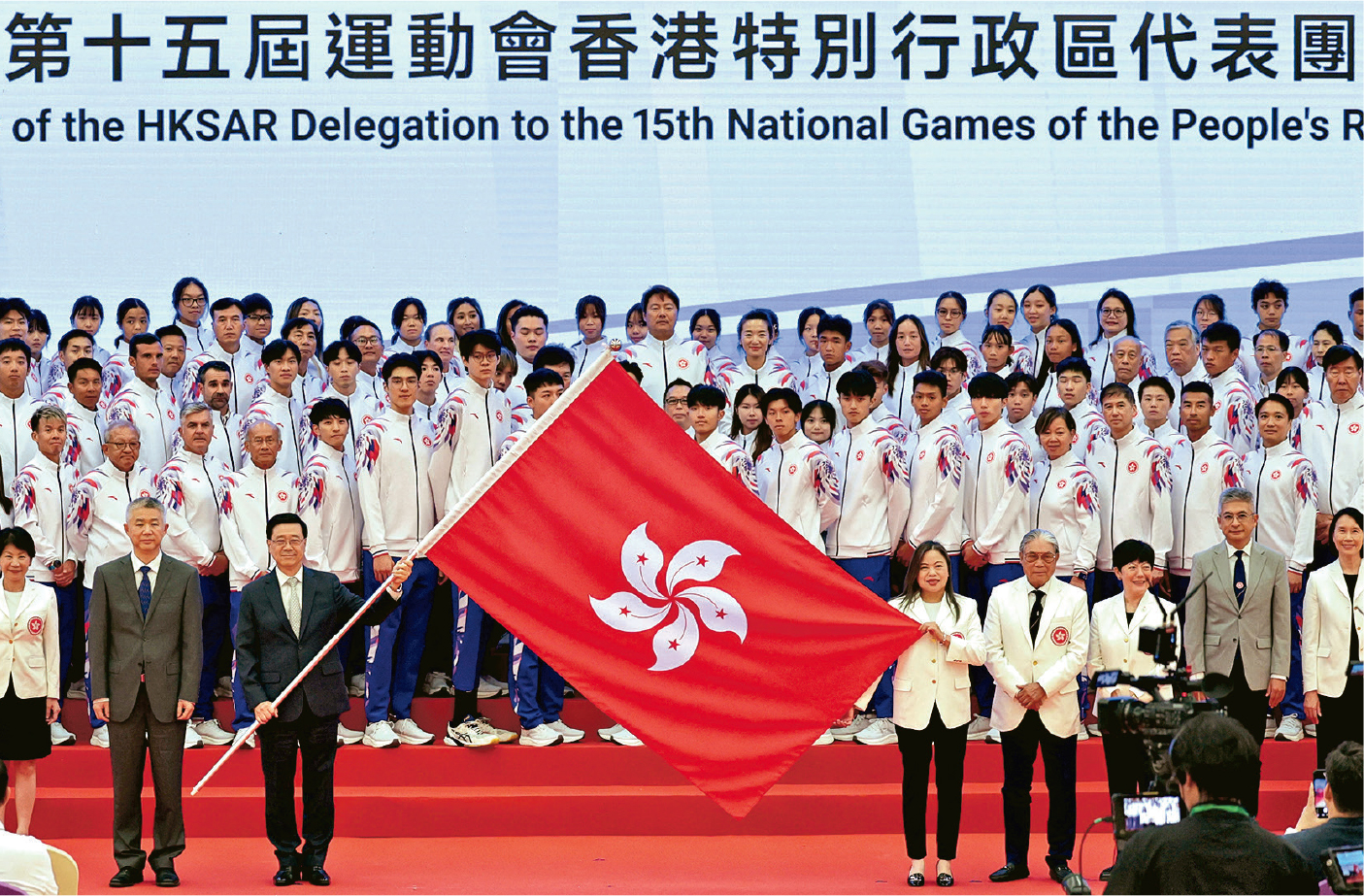 全運會將於下月9至21日在廣東、香港和澳門3地舉行,港隊昨午授旗儀式有行政長官李家超、中聯辦副主任孫尚武及文體旅局長羅淑佩等主禮。