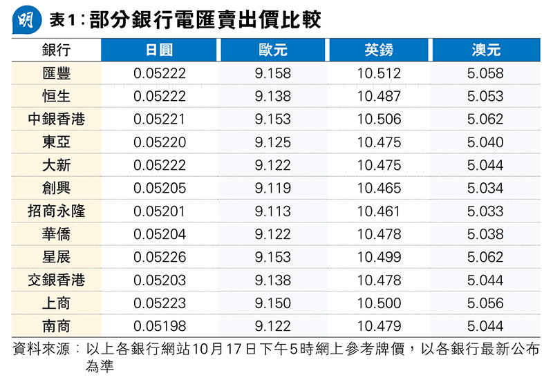至於何處兌換,找換店向來予人兌換率較銀行為吸引的印象,但其實於銀行以電匯價(TT Rate)兌換外幣的匯率,也有機會較於找換店兌換外幣現鈔的匯率為低。對於計劃一家大細出遊,又或出遊時間較長人士,旅費隨時可逾萬港元,即使分批兌換日圓金額亦不少,更應在兌換率上貨比三家。比較10月17日下午5時多間銀行的參考牌價,其中南洋商業銀行的每1日圓兌港元的電匯賣出價0.051982(見表1),便較同日不少找換店的現鈔賣出匯價主要介乎約0.052至0.0521為低。