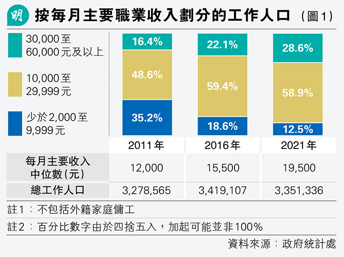 大前研一的「M形社會」大意指中間收入階層人數縮少,其減少部分流向最低及最高階層,變成社會兩極分化。圖1是2011、2016及2021年3次香港人口普查的工作人口,每月主要職業的收入分層的人數變化。圖1的10年時間跨度的3個年份數據,可以大致扣減通脹的影響。圖1看到最低層的少於2000至9999元每月收入,2011年佔327萬工作人口的35.2%,5年後減至佔342萬工作人口的18.6%,再5年後,再減至佔335萬工作人口的12.5%。通脹因素理應不會有如此作用吧!