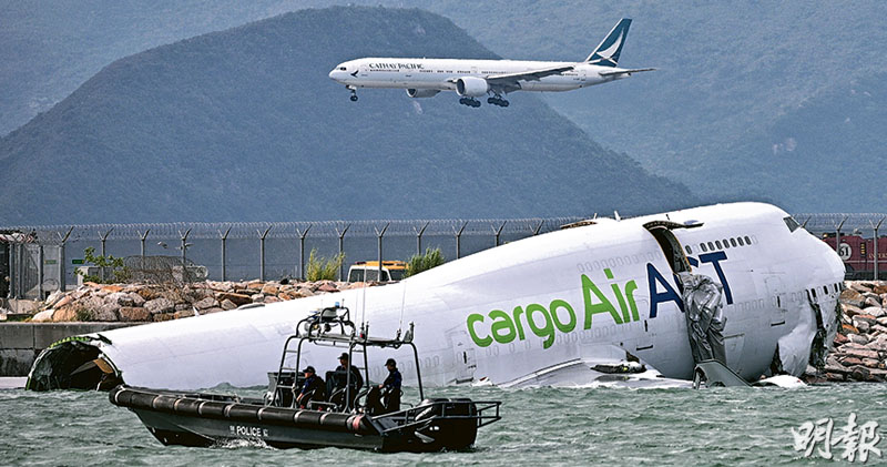 【明報專訊】香港國際機場發生26年來最嚴重航空事故,一架由迪拜阿勒馬克圖姆國際機場抵港的阿聯酋航空貨機(航班編號UAE9788),昨凌晨3時53分在北跑道降落後突轉向滑出跑道,衝出鐵絲網後撞到一輛巡邏車,雙雙墜海,車上兩名機場保安有限公司人員死亡;貨機4名機組人員獲救無礙。民航意外調查機構將事件定性為「意外」,正打撈俗稱「黑盒」的飛行記錄儀;警方稱會向調查機構了解情况,不排除日後刑事調查。機管局機場運行執行總監姚兆聰表示:「正常飛機是無論如何都不會轉出海那邊。」