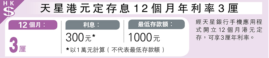經濟 天星港元定存息12個月年利率3厘 發佈於 2 天 前 2025 年 10 月 21 日 By 明報 【明報專訊】經天星銀行手機應用程式開立12個月港元定存,可享3厘年利率。(圖) 日報新聞-相關報道: 富融美元定存3個月年利率3.8厘 (2025-10-21) 相關文章:富融美元定存3個月年利率3.8厘 (2025-10-21) Up Next 廣和通輝立暗盤跌1% 1個多月再有新股「潛水」 不要錯過 非本地生大增 商廈酒店改宿舍湧現 高力料2028年欠12萬宿位 星星地產:推動教育之都成機遇 繼續閱讀 贊助商 猜你喜歡