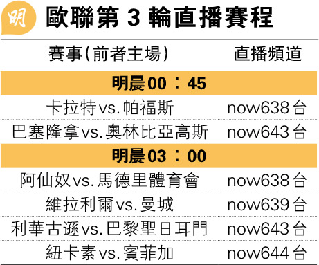 近5場歐聯作客不勝的曼城將征戰仍未開齋的維拉利爾。今屆兩戰取1勝1和的「藍月」是役料有鋒將馬莫殊及卓基回歸,惟中場洛迪卡斯簡迪將續與後衛卡胡辛諾夫養傷無緣披甲,但在連同國際賽近11場皆有入球的鋒將艾寧夏蘭特領銜下,仍有望擊敗近8次對英格蘭球隊不勝的「黃色潛艇」,以取得睽違逾1年的歐聯客勝。至於另一英超球隊紐卡素明晨將在主場面對頭兩輪全敗的葡超球隊賓菲加。