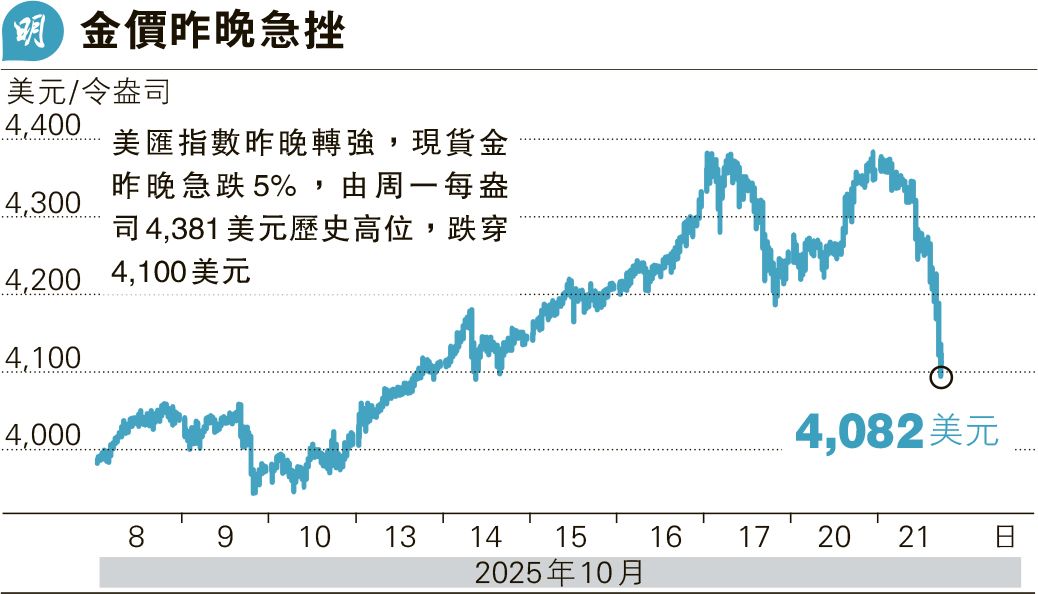 【明報專訊】金價在減息預期及避險需求下持續破頂,不過美元昨晚轉強,獲利盤湧現。隨着美匯指數逼近99水平,黃金相對於美元以外的投資者變得昂貴,現貨金昨晚急跌5%,由周一每盎司4381美元歷史高位,跌穿每盎司4100美元,低見4082美元,是4年來最急劇跌幅。期金由周一每盎司4398美元高位,跌至昨晚4093美元。