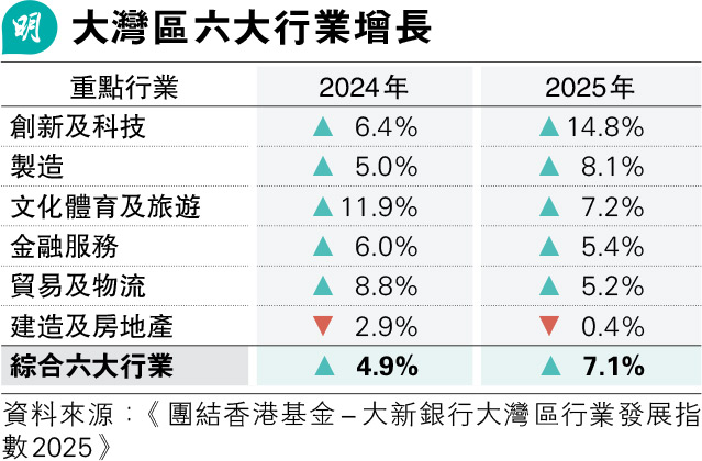 報告訪問逾3400間大灣區企業,分析逾120個指標,指數顯示大灣區綜合6個重點行業按年增長率,由去年4.9%加快至今年7.1%,其中創科業成增長「火車頭」,製造業持續邁向智能化發展至高增長,建造及房地產業跌勢則放緩(見表)。香港金融服務業指數為85.6,按年增6.2%,貿易及物流業則為82.5,按年增約7%,文體及旅遊業為79.3,報告特別提到啟德體育園截至9月中旬舉辦逾30場大型活動,文體旅業經濟貢獻按年增13%,連續兩年居首。