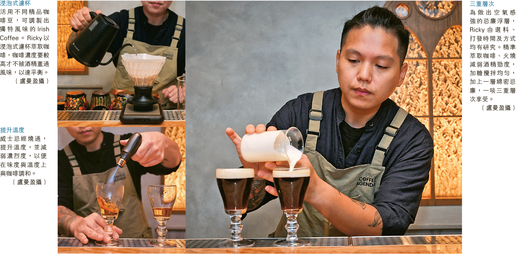 待一切妥當,結合成一杯,他自信端出:「來試試幸福的味道,快趁熱飲。」緊記大口喝下,同時喝到忌廉微涼、綿密輕盈,溫咖啡富果香,威士忌溫醇不嗆喉,三者和諧的層次感淌入體內。「還可以更好,永遠沒有最好飲。選用不同精品咖啡豆,可做出不同味道。」不知明年世界賽,Ricky會「升磅」多少?說的是Irish Coffee美味程度,非體重也。